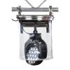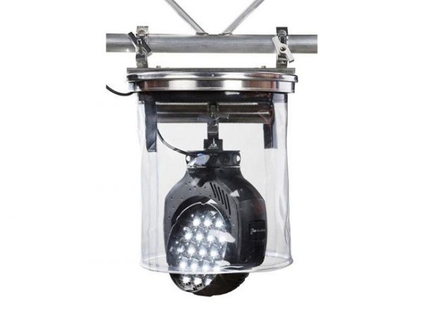 It is open to the bottom, providing rain protection for strong discharge lamps that would destroy a closed air dome.