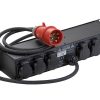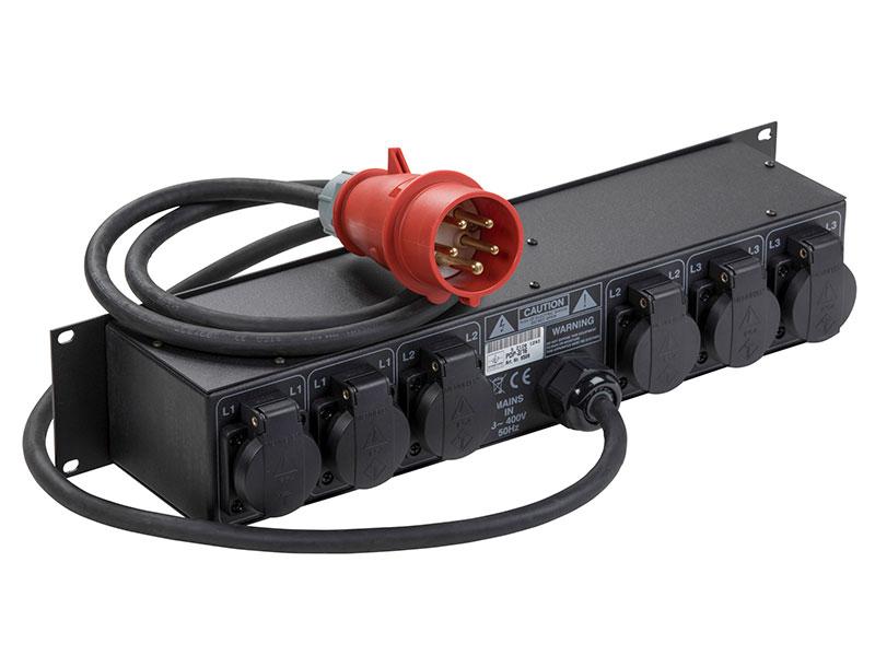 16 A Power Distribution with three SCHUKO- and one16 A CEE outputs on the front- and six SCHUKO outputs on the backside.